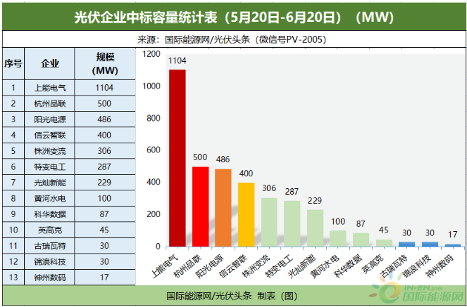 其中,上能電氣中標1104MW,排名第一,杭州品聯(lián)500MW排名第二,陽光電源486MW列第三名。