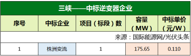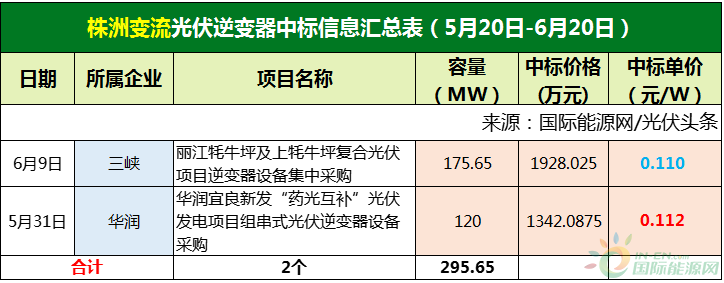 三峽集團、華潤兩大央企各自定標1個逆變器采購項目,容量分別為175.65MW、120MW。株洲變流技術(shù)成為最大贏家,全攬這兩個項目。