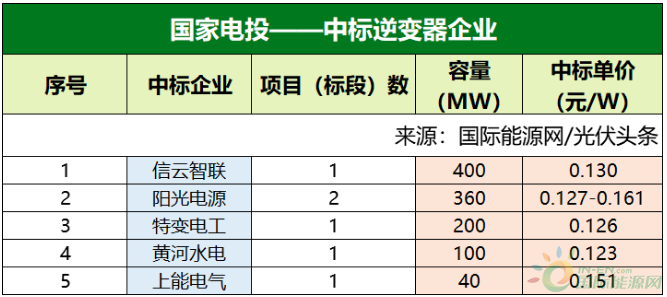 6月6日,國家電投6.7GW逆變器集采項目定標,信云智聯(lián)、陽光電源、特變電工、黃河水電、上能電氣成為最大贏家。其中、信云智聯(lián)、陽光電源、特變電工、黃河水電中標組串式逆變器采購標段,4個標段采購容量1GW,儲備容量5GW,合計6GW。陽光電源、上能電氣中標集中式逆變器采購標段,合計容量700MW。具體中標情況如下: