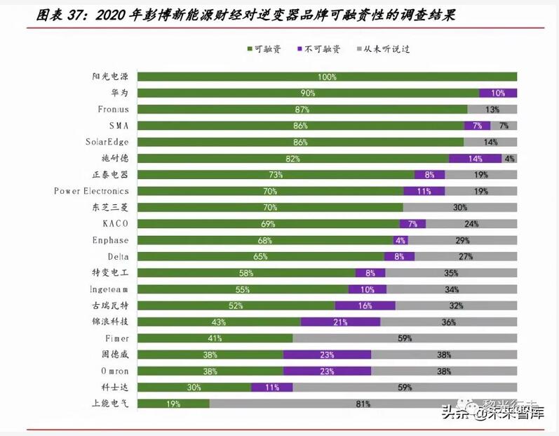2020年彭博新能源財經通過向可再生能源項目的投資方發放問卷等形式,對逆變器品牌的可融資性進行了調查。排名較高的品牌意味著更易幫助項目開發商獲得銀行融資,利于綁定長期客戶群體;另一方面說明該品牌逆變器在產品質量、運行表現、售后服務支持和長期可靠性方面表現突出,利于海外布局的拓展。陽光電源以100%的得票率當選“全球最具融資價值的逆變器品牌”,華為位居第2名,共有9家中國企業上榜。重要的是,該調查結果展現出國內逆變器企業在海外擴張業務的過程中,品牌價值得到提升,逐步得到海外投資方的認可。