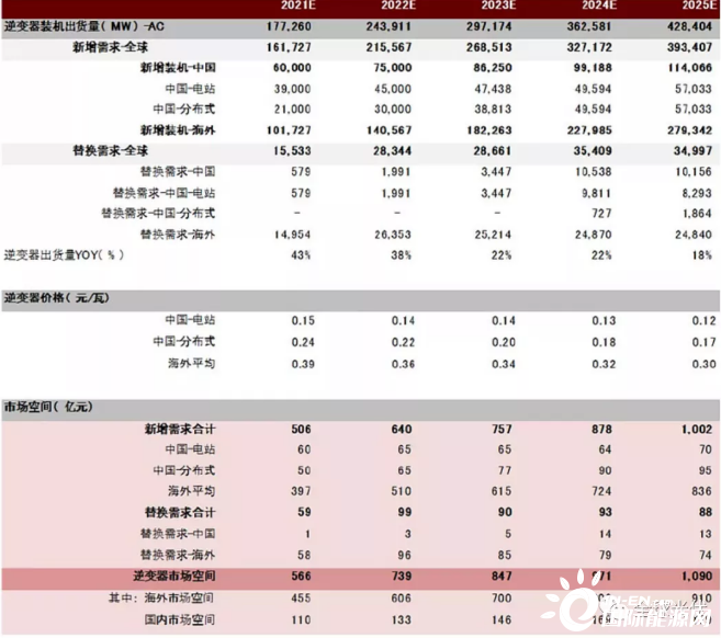 光伏逆變器需求主要來自新增裝機需求及存量替換需求兩部分,隨光伏行業(yè)需求快速增長及存量替換需求加速,我們測算2025年光伏逆變器市場空間可達1090億元。