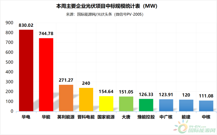 國際能源網/光伏頭條(PV-2005)統計本周華電、華能、英利能源等企業發布了60個中標項目,總規模3017.34MW。其中,華電以830.02MW位居第一,華能以744.78MW位居第二,英利能源271.27MW位居第三。其余排名前10企業定標容量都超過了100MW。