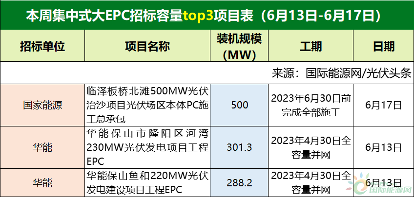 國際能源網/光伏頭條(PV-2005)對6月第3周(6月13日-6月17日)光伏EPC招/中標項目不完全統計,本周招標規模合計3556.14MW,中標規模3017.34MW,招中標規模合計6573.48MW。此外,本周多晶硅、電池片紛紛上漲,組件龍頭企業加速產業鏈垂直一體化,同樣值得關注!