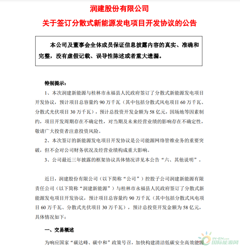協(xié)議顯示,為響應(yīng)國家“碳達(dá)峰、碳中和”政策號召,加快構(gòu)建清潔低碳安全高效能源體系,潤建新能源擬與永福縣人民政府在分散式光伏、分散式風(fēng)電等領(lǐng)域進(jìn)行戰(zhàn)略合作,通過整合利用永福縣閑散的水塘、洼地、灘涂、荒山荒地、工業(yè)園區(qū)等閑置土地,以及土地性質(zhì)滿足風(fēng)光新能源建設(shè)要求的一般農(nóng)用地、林地資源,實施整縣分散式光伏發(fā)電、分散式風(fēng)力發(fā)電項目。預(yù)計項目總?cè)萘考s90萬千瓦(其中包括分散式風(fēng)電項目60萬千瓦、分散式光伏項目30萬千瓦),預(yù)計風(fēng)電投資金額46億元,光伏投資金額12億元總投資開發(fā)金額為58億元。