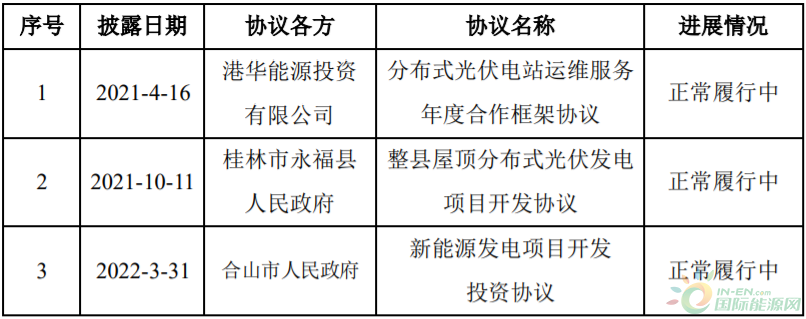 除了與桂林市永福縣合作,近三年來潤建股份還相繼港華能源投資有限公司、合山市人民政府均有新能源源發(fā)電項目開發(fā)投資協(xié)議簽訂,目前正在履行中。