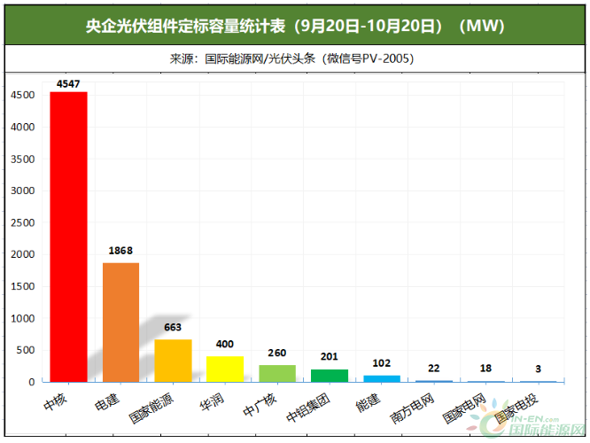國際能源網/光伏頭條(PV-2005)根據公開招中標信息梳理發現,9月20日-10月20日,央企定標項目(標段)數為42個,占項目總數的82.35%;定標容量為8.08GW,約占總定標容量的92.85%。