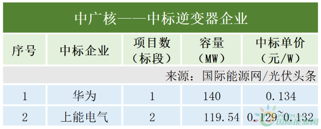 中廣核有3個項目定標,合計容量259.54MW。其中華為中標140MW,單價為0.134MW。上能電氣中標兩個項目,合計容量119.54,中標單價為0.129元/W以及0.132元/W。