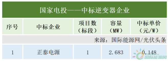 國家電投在本統計周期有1個項目定標,容量2.683MW,正泰電源作為中標人,中標價為0.148元/W。