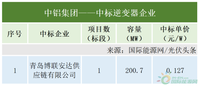 中鋁集團有1個逆變器采購項目定標,容量為200.7MW。青島博聯安達供應鏈有限公司作為中標人,中標價格為0.127元/W。