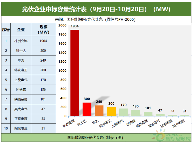 國際能源網/光伏頭條(PV-2005)統計,9月20日-10月20日國內逆變器招投標市場,株洲變流、華為、陽光電源、特變電工、上能電氣、科華數據、固德威、特變電工、正泰電源等25家企業,共同贏得了8.71GW的逆變器招標采購訂單。